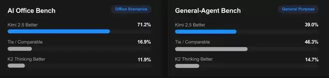 KImi团队针对真实职场场景,设计了两套内部专家生产力基准测试。AI办公基准测试评估端到端的办公输出质量,而通用智能体基准测试则以人类专家表现为标准,衡量多步骤生产级工作流的表现。