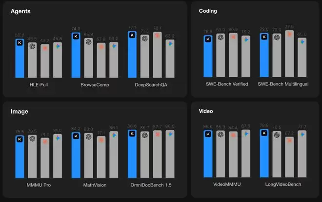 基准测试上,在Agents方面,HLE-Full(综合推理)、BrowseComp(浏览交互)、DeepSearchQA(深度搜索问答)三个基准测试中K2.5得分均位列第一;在编码方面,K2.5在SWE-Bench Verified、SWE-Bench Multilingual两项中均排名第一;在图像多模态方面,K2.5在文档理解测试mniDocBench 1.5中得分88.8,为第一名。