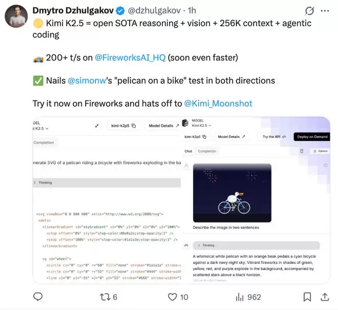 外网网友对Kimi K2.5模型的评价可以说是好评如潮。FireworksAI联合创始人兼首席技术官Dmytro Dzhulgakov评论称“Kimi K2.5=开源SOTA推理+视觉+256K 上下文+智能体编码”。