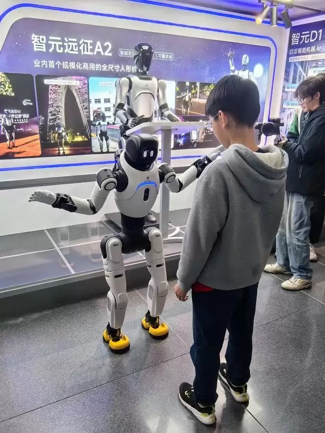 走进“明日行者”展区,记者看到了智元、傅利叶两家上海企业研发的人形机器人。“大家好,我是灵犀X1。”在智元展区,一台1.3米左右的人形机器人可与观众互动。它的身后,是业内首个规模化商用的全尺寸人形机器人——远征A2,灵犀X1向大家介绍了这款机器人的亮点和应用场景。“你会唱歌、跳舞吗?”一名小学生问灵犀X1。刚才还在做导览的机器人立即切换角色,挥动手臂、又唱又跳。萌萌的舞姿引得人们纷纷掏出手机,拍下这一场景。