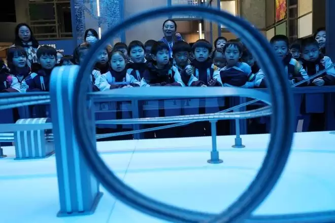 10个展区的展示主题涵盖人工智能、量子科技、能源、材料、航空、生态、健康等科技热点领域。比如在材料和能源领域,高温超导是当前炙手可热的一个科研方向,用高温超导材料打造的核聚变装置,被视作“终极能源”。在“材料魔方”展区,这种未来材料的神奇特性,通过“超导赛车”展项直观地呈现在观众眼前——讲解员从-196℃液氮中取出一块高温超导材料,将它放在装有磁体的赛道上,只见它悬浮在赛道上方,像磁悬浮列车那样飞速前行。“超导材料具有迈斯纳效应,能将磁场排斥到物体外部,形成一片无磁区域。这种特性让超导材料在磁场中产生排斥力,实现了悬浮效果。”讲解员告诉观众。