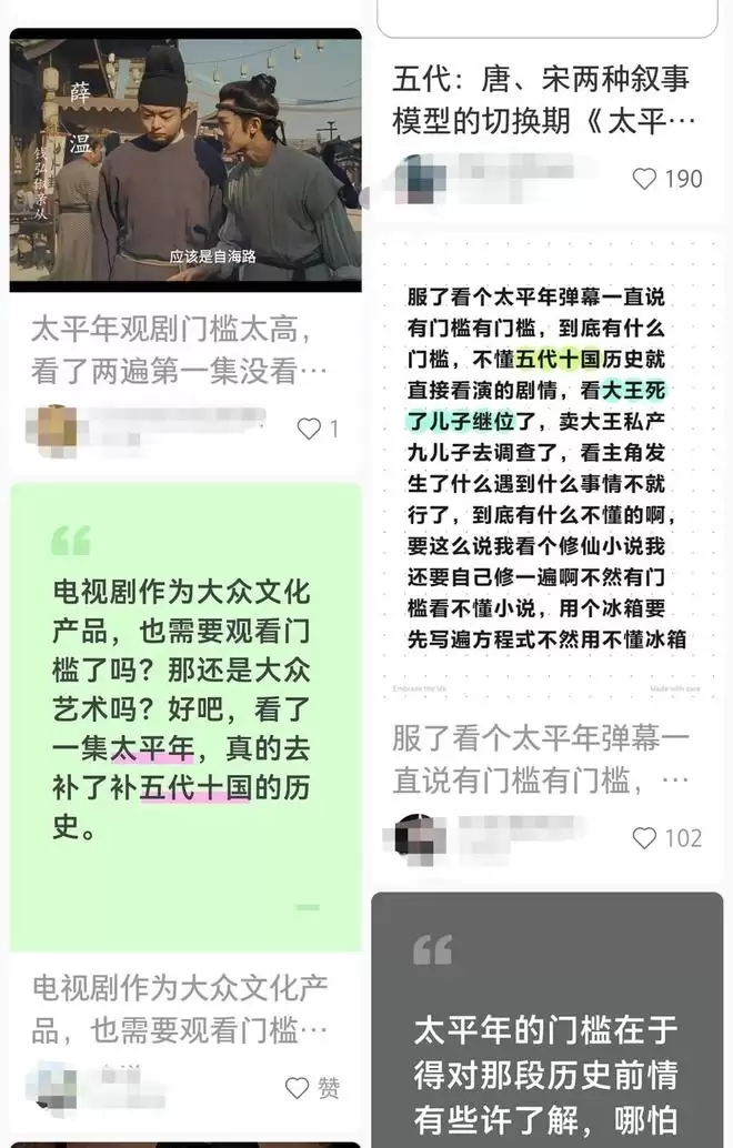 也有观众认为,所谓出场人物太多劝退、门槛高是伪命题,“《太平年》看似人物繁多,其实没必要每个人都记住,很多人上一秒出场,下一秒就没了,重要人物会反复出现”“除了专有名词不知道,日常对话还是好懂的”。也有人一针见血指出,该剧的观看门槛不在历史,而在于专注度,“能否看得懂,关键是能否静下心来看剧,能否在看电视剧时忍住不玩手机”。
