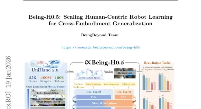 A:Being-H0.5是由BeingBeyond团队开发的革命性机器人智能系统,它的核心能力是让30种完全不同的机器人共享同一套智能"大脑"。这个系统通过学习人类的操作行为,创造了一种机器人的"世界语",让不同类型的机器人都能理解和执行相同的任务,就像让说不同方言的人都能用普通话交流一样。