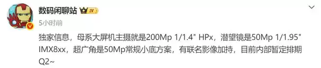 甚至可以说新机将搭载一颗2亿像素的三星HPx主摄,并有联名影像加持,内部暂定于2026年第二季度亮相。
