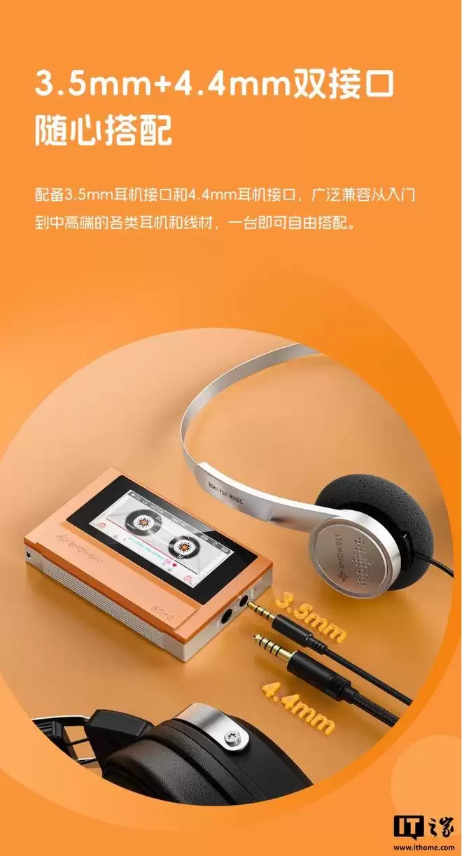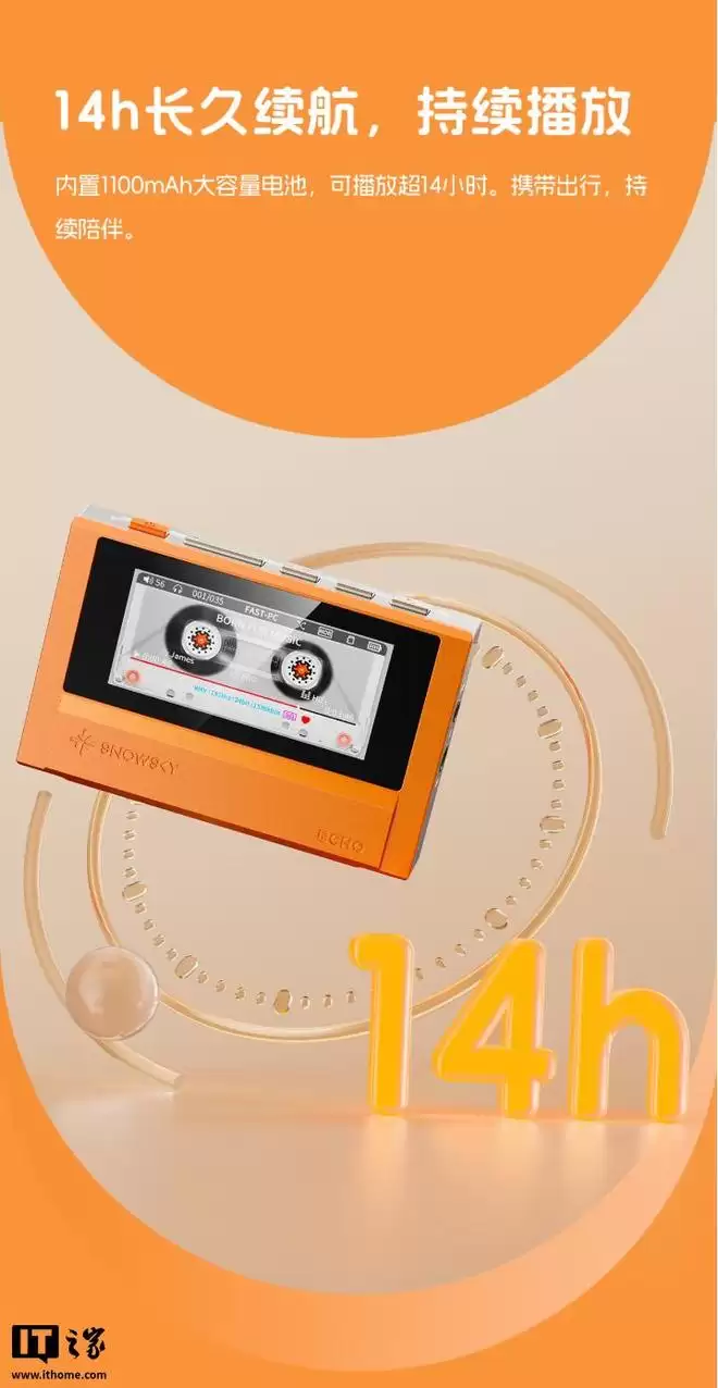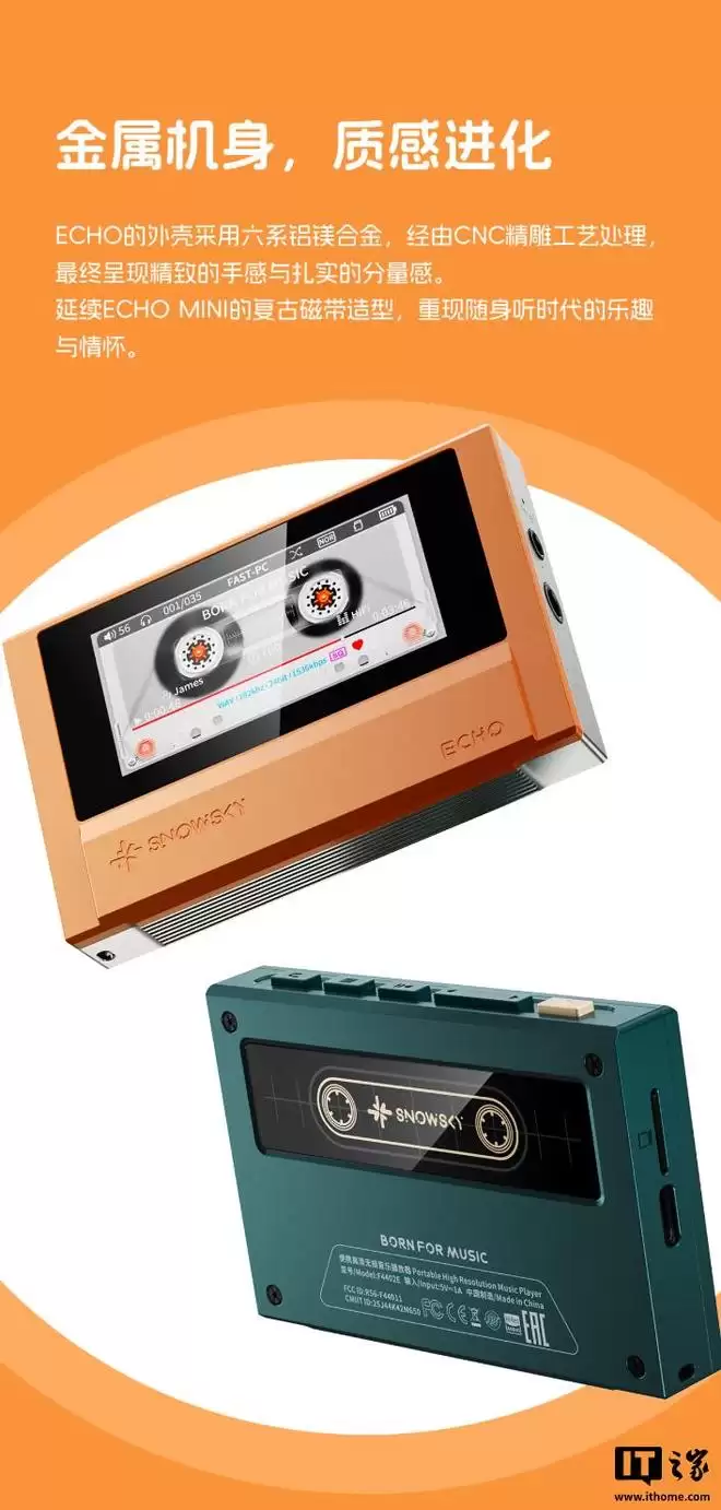IT之家 1 月 27 日消息,飞傲子品牌雪漫天现已推出 ECHO 播放器,新品主打磁带随身听复古设计,带有 3.5mm 单端 +4.4mm 平衡耳机接口,内置双 DAC 芯片,新品预约价 399 元。