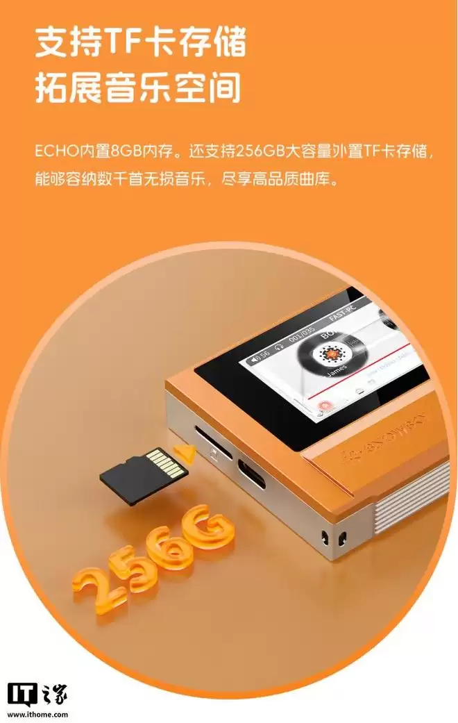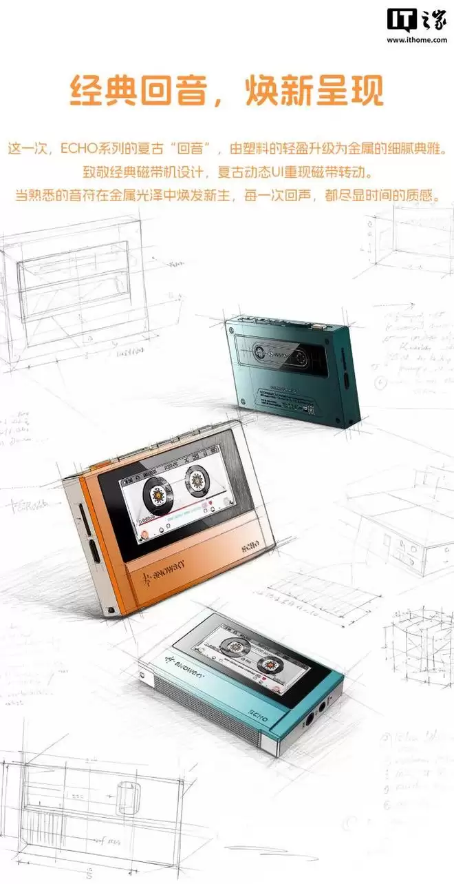 据介绍,这款产品搭载六系镁铝合金外壳,使用 CNC 精雕工艺处理,延续 ECHO MINI 的复古磁带随身听造型,尺寸为 85*55.5*14.3mm,内置 2.39 英寸高分辨率彩色屏幕,支持切换 UV 表、磁带、音频律动等复古动态 UI。