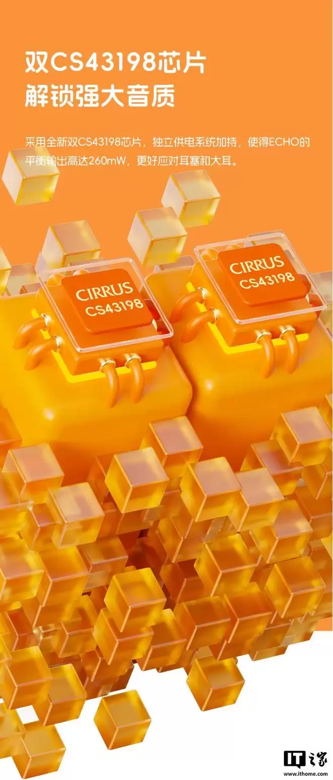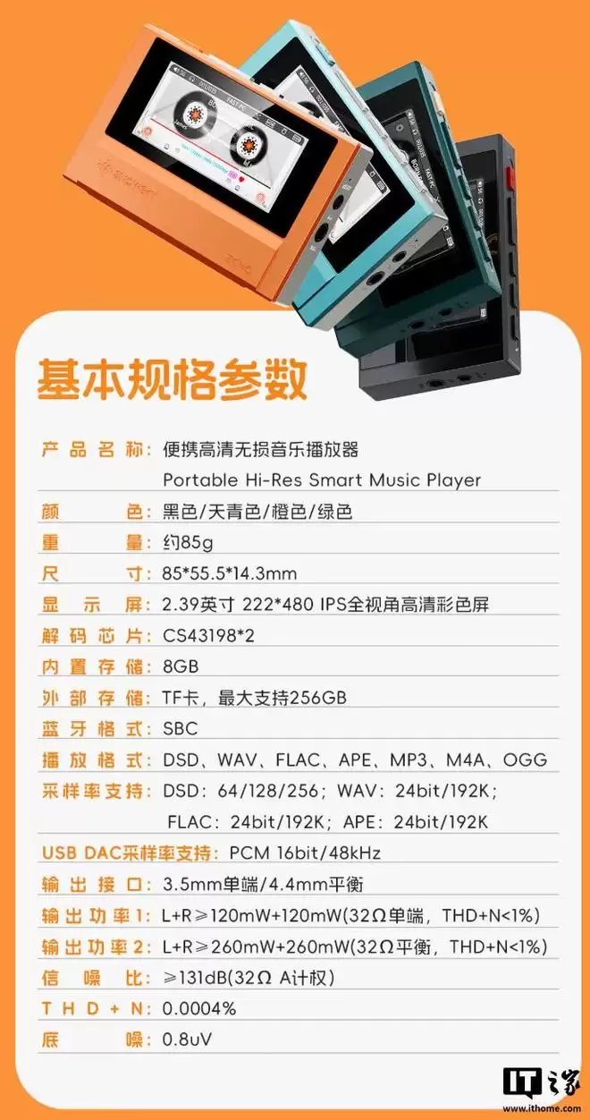 规格方面,这款播放器搭载双 Cirrus Logic CS43198 DAC 芯片,拥有独立供电系统,平衡输出可达 260mW,更好应对耳塞、大耳等,自带 3.5mm 单端 +4.4mm 平衡耳机接口,广泛兼容各种 HiFi 耳机。