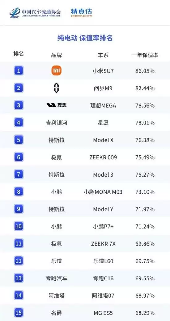 2025汽车保值率发布:小米SU7纯电第一,获雷军致谢