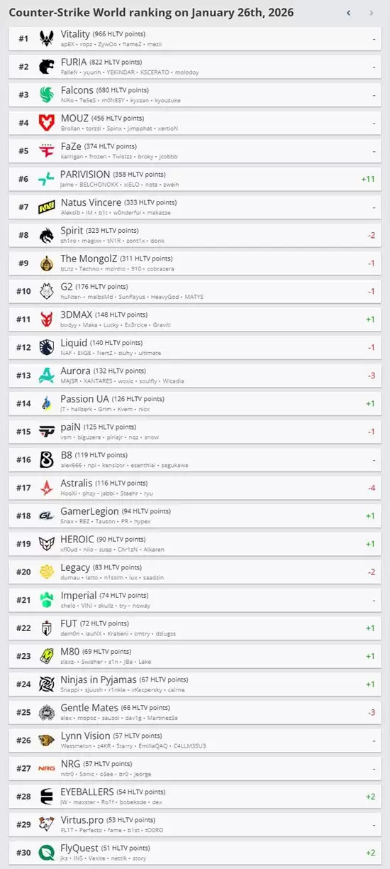 HLTV本周排名出炉:赏金赛冠军PARIVISION飙升11位,跃居第六名