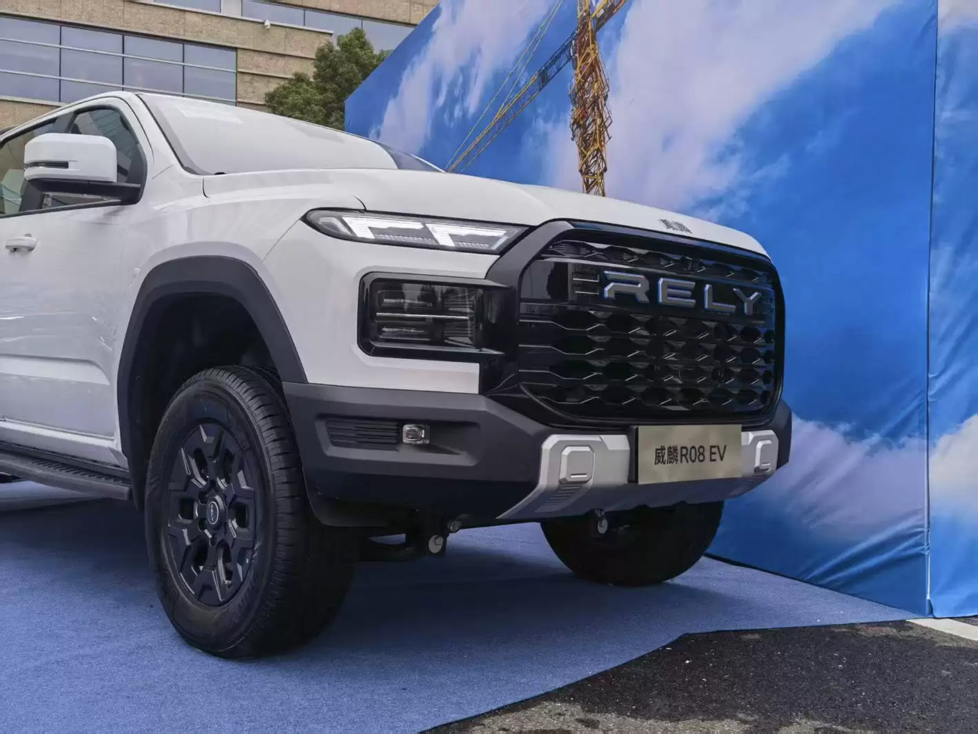外观设计上,威麟R08 EV延续了家族标志性的“麒麟力量美学”理念。前脸采用甲胄式造型的超大尺寸进气格栅,搭配分体式“麒麟瞳”LED大灯组,形成极具辨识度的视觉效果。与常见的新能源车型不同,新车并未采用封闭式前脸设计,而是在RELY英文标识处运用蓝色镭雕装饰,既保留了品牌特征,又凸显了新能源身份。车身侧面通过265mm宽胎与高离地间隙设计,进一步强化了越野气质。