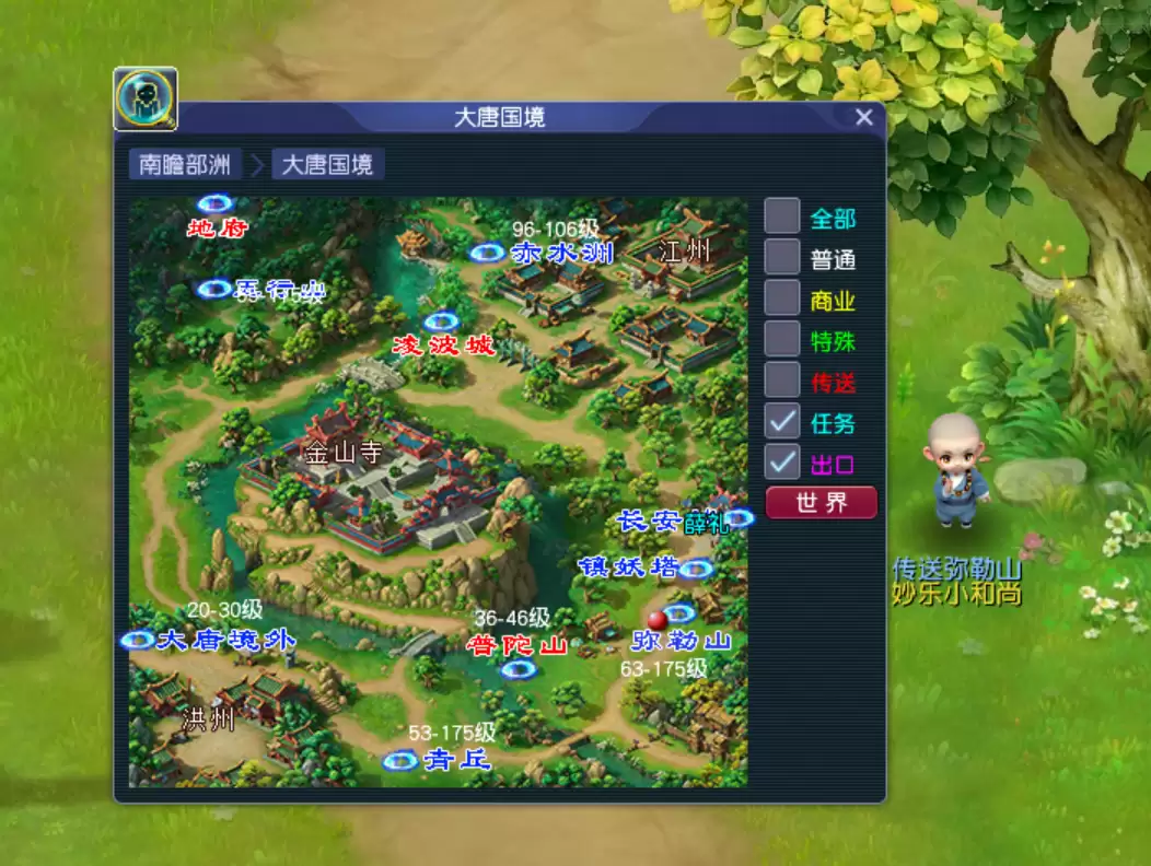 玩家需要先抵达大唐国境,在妙乐小和尚(坐标311,93)处接取任务,即可被引至弥勒山。