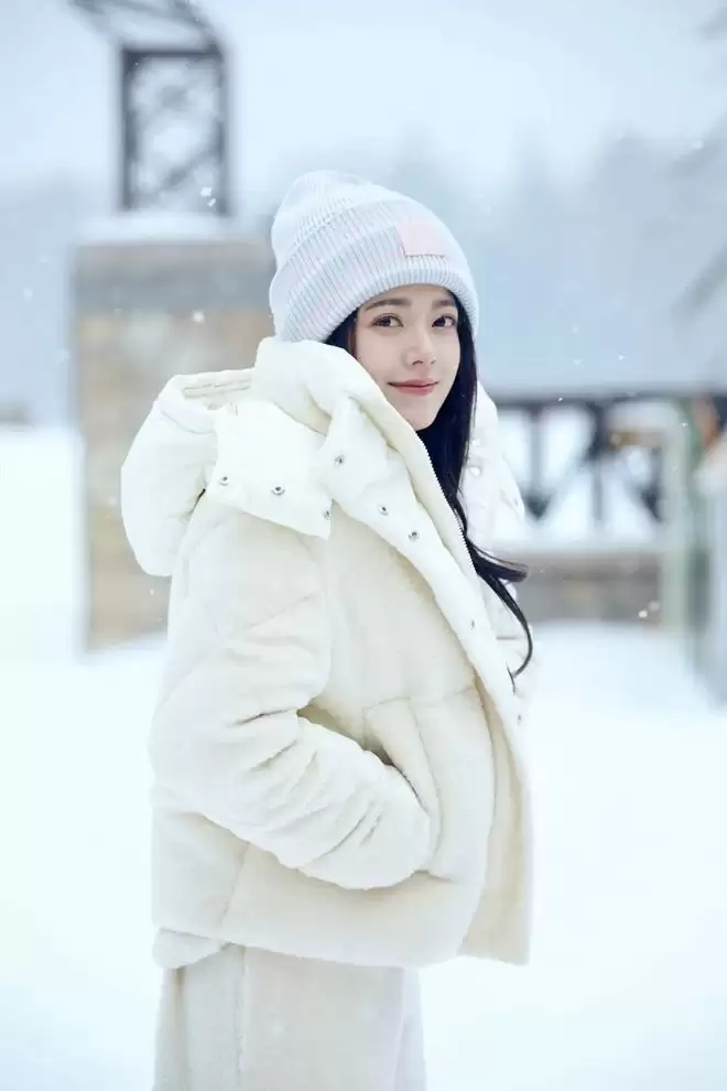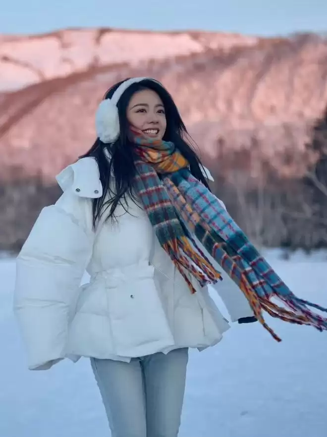 和家人一起去长白山旅游时,麦麦穿了一身白色羽绒外套,搭配牛仔裤,很日常的冬日 ootd,但她用配饰为整套造型增加了亮点,用耳罩、帽子、围巾点亮全身造型,也增加了冬季穿搭的层次感。