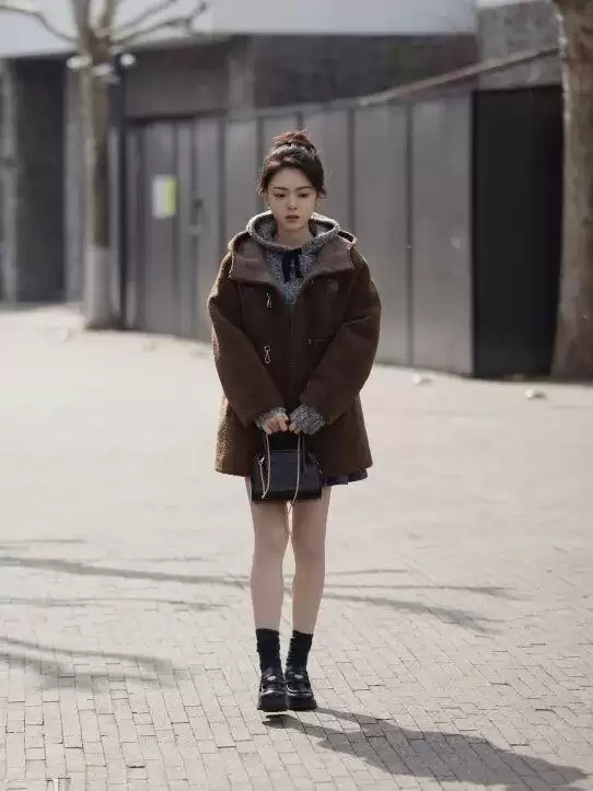 出席朋友聚会时,选择了一件 SHUSHU/TONG 的灰色连帽上衣搭配 Miu Miu 短裙,外套是一件非常秋冬的美拉德泰迪熊牛角扣大衣,来自 d’zzit,复古又时髦,下装消失造型展现完美腿部线条。
