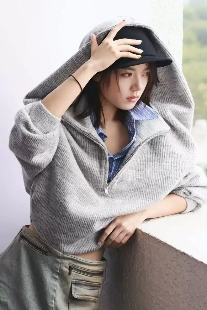 下面这件羊羔绒的马甲同样来自 Isabel Marant,很适合当下寒冷的天气。麦麦内搭了灰色针织衫与自己代言的 Miu Miu 棒球帽,非常法式,松弛自在。