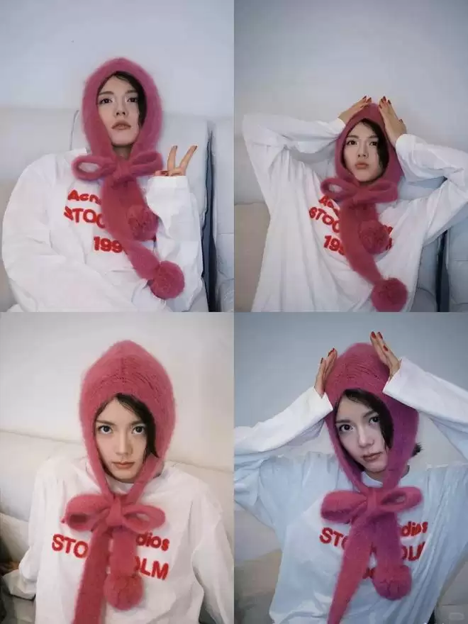 日常居家照又是一个标准的“萌妹”,白色字母长袖 Tee 搭配粉色马海毛针织帽,温暖又可爱,整套造型来自 Acne Studios。