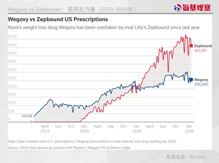 在减重这个确定性的市场中,诺和诺德的先发优势清晰可见。较早前,礼来凭借注射型减肥药Zepbound占据了大部分市场份额,其处方量甚至已经显著超过了Wegovy。