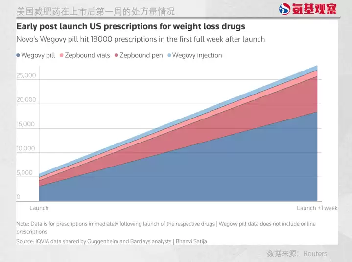 1月23日,根据IQVIA数据显示,口服减肥药Wegovy在美国上市后的第一个完整周内(截至1月16日),处方量就达到了18,410张。仅在刚上市的前4天,医生们就开出了3,071张处方。