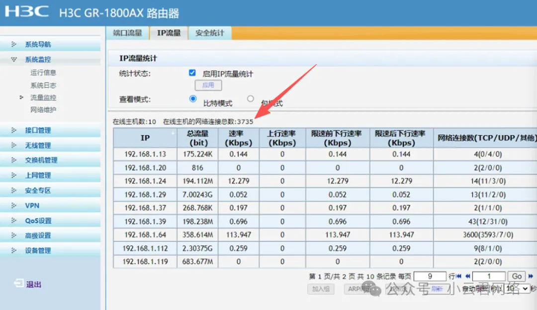 出口路由器使用的是H3C设备,通过其管理界面,我们发现可以查看实时的在线会话数: