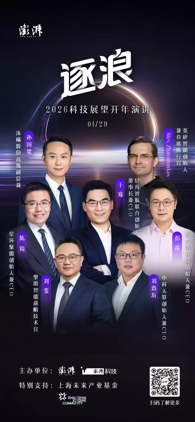 作为深耕科技创新领域的公共媒体平台,澎湃新闻将于1月29日在上海举办“2026科技展望开年演讲”,汇聚来自七大前沿科技领域的企业代表与顶尖创新实践者,共同分享技术发展的脉络与迭代的最新动向,在思想的碰撞中捕捉未来机遇。这不仅是一场单向的知识宣讲,更是专属科技前沿探索者的思想交锋场。