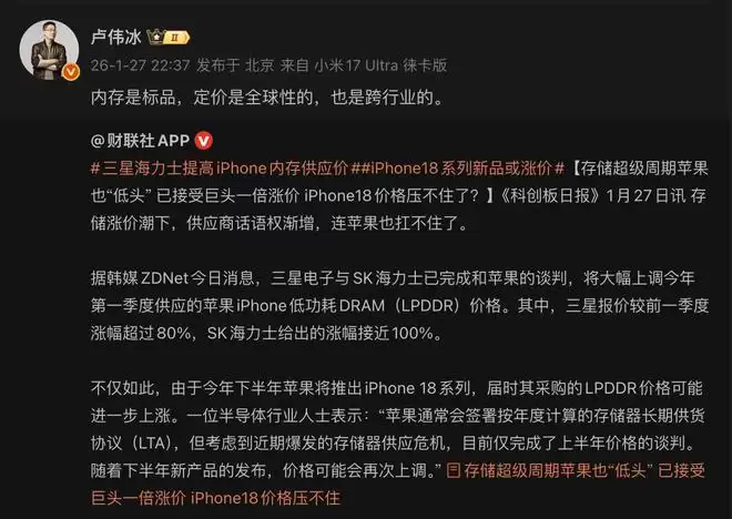 值得注意的是,昨晚小米集团总裁卢伟冰在微博上转发相关报道,称「内存是标品,定价是全球性的,也是跨行业的」,侧面印证了当前存储涨价已成为行业普遍现象。