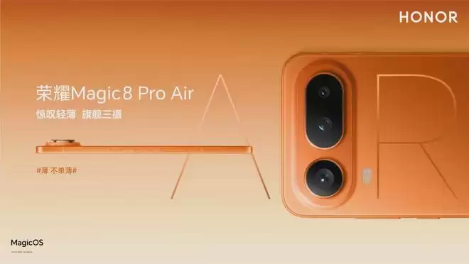 两款机型的主打色调均为橙色,其中 Power 2 的镜头模组设计向 iPhone 17 Pro 系列靠拢,Magic 8 Pro Air 则对标 iPhone Air 系列,连宣传海报都出奇一致。