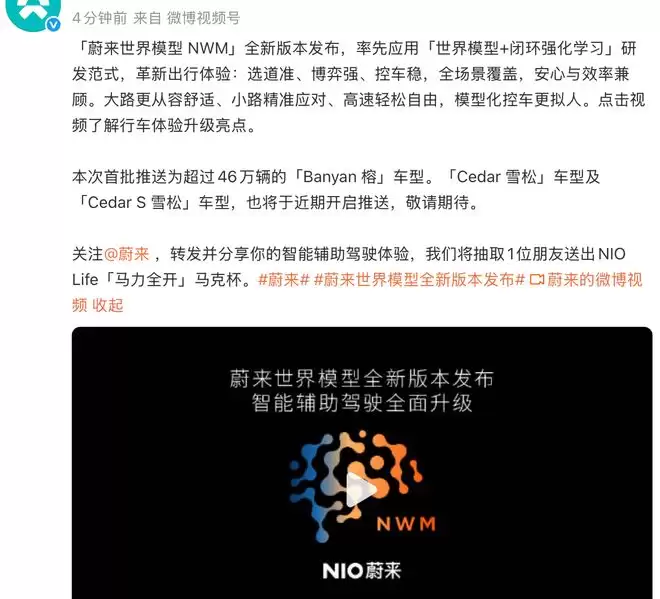 蔚来NWM新版智能推送:世界模型驱动驾驶体验革新