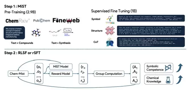 为了打破僵局,谢童及团队提出了 MiST 框架。“其核心逻辑很简单:在上 RL 之前,先把模型的‘化学语法+化学能力’补齐,让它具备被 RL 教会的资格。”谢童补充道,“它的重点不是让模型去死记硬背更多知识,而是先把三件事固化进模型的输出分布:语法正确性(能写对)、化学知识可解性(能理解)、以及推理表达方式(能稳定地推)。这样后面的 RL 才有可优化的空间,否则正确解都进不了候选输出,奖励信号再强也教不动。”
