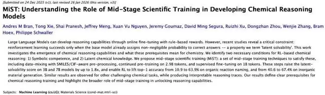 近日,律动造物(Green Dynamics)创始人谢童领衔的新南威尔士大学(UNSW)团队,与瑞士洛桑联邦理工 (EPFL) Philippe Schwaller 团队联合发表论文:《MiST: Understanding the Role of Mid-Stage Scientific Training in Developing Chemical Reasoning Models》。这项工作为科学大模型打入了一针“工程化的清醒剂”:它不再盲目优化传统的 next-token loss 或困惑度(Perplexity),而是提出了 MiST(中段科学预训练)框架——一套在进入强化学习前,用于评估与塑造科学推理可解性的工程化协议。
