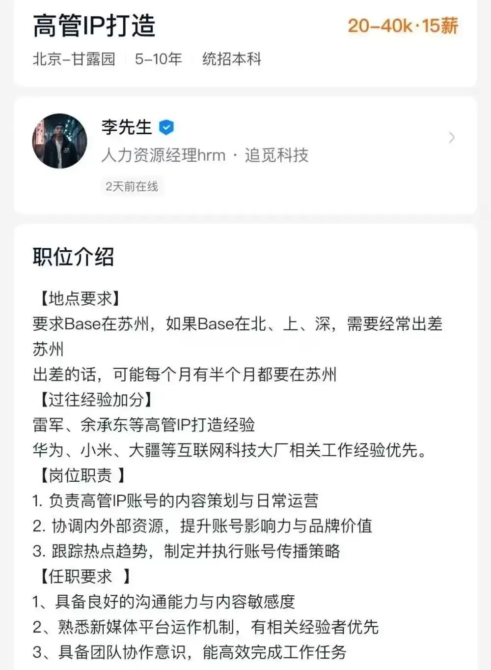 不过,有细心的网友发现,在某招聘软件上,追觅科技新增了“高管IP打造”的职位招聘信息,所属部门为集团公关部,月薪范围设定在2万至4万元。职位介绍显示,明确将拥有雷军、余承东等知名企业家高管IP打造经验列为加分项,同时优先考虑具有华为、小米、大疆等互联网科技大厂相关工作经验的求职者。