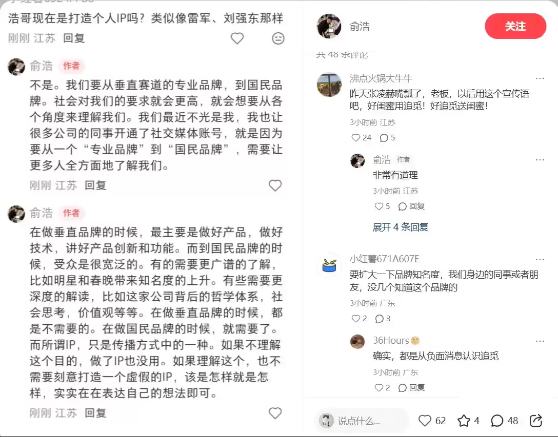 与此同时,他还通过小红书平台发文,澄清自己并非要模仿雷军、刘强东打造个人IP。有网友在评论区提问:“您这是在打造个人IP吗?就像雷军、刘强东那样。”俞浩的回应非常直接:不是。他解释道,我们的目标是让品牌从垂直领域的专业形象,走向更广泛的国民认知。
