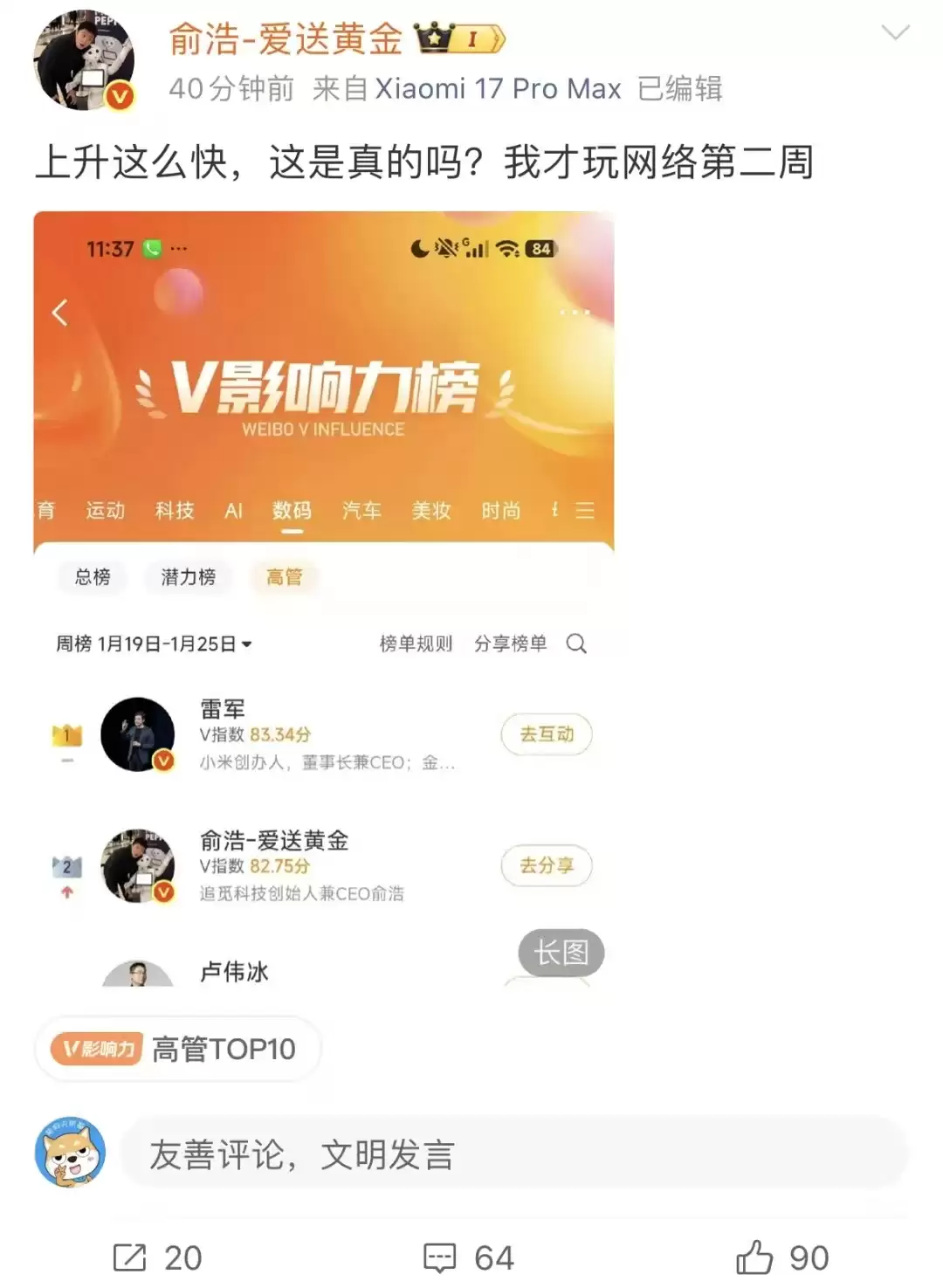1月28日有消息透露,追觅科技CEO俞浩日前在微博分享了一张截图,显示自己的V影响力周榜排名已攀升至第二位,仅次于雷军。俞浩在博文中写道:“这排名蹿升得也太快了吧?我这才开始玩社交媒体两周而已。”