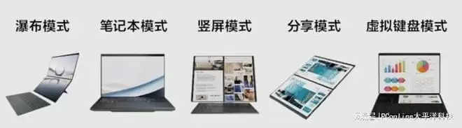 虚拟键盘模式下,机身轻约1.35kg,并采用全新的铰链设计,相比上一代缝隙缩小68%,实现五种灵活多变的工作模式切换,包括瀑布/分享/竖屏/虚拟键盘以及笔记本模式,当机身开合角度超过175度,将自动显示两种分享模式供选择,屏幕折起即可退出该模式,全能驾驭团队协作、方案共享等多个场景。
