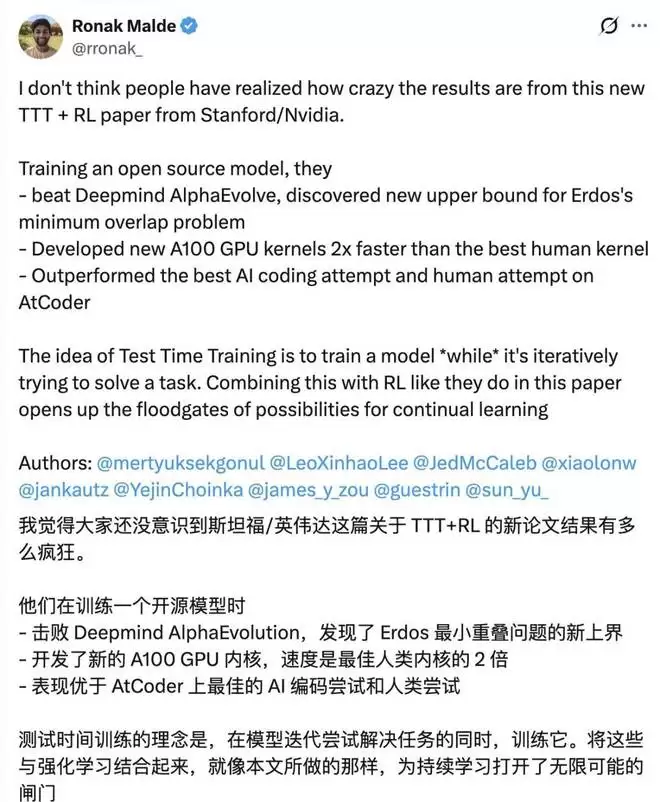 结果显示,该方法在多种任务上取得了好成绩,包括击败了 DeepMind 的 AlphaEvolve;数学领域 在 Erdős 最小重叠问题上取得了新突破;在 GPUMode 竞赛中,开发出了比人类最佳内核快两倍的全新 A100 GPU 内核;在 AtCoder 测试中超越了最佳 AI 代码和人类代码;在单细胞分析的去噪任务中取得最好成绩……