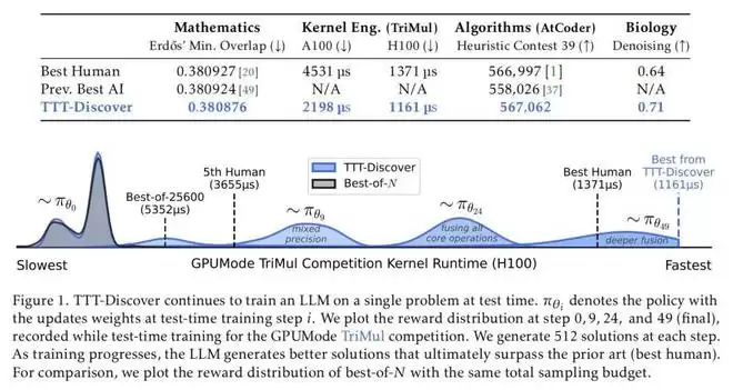 团队在四个截然不同的领域 —— 数学、GPU 内核工程、算法设计和生物学问题上评估了 TTT-Discover。