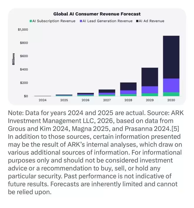 当地时间1月27日,素有“女版巴菲特”、“木头姐”之称的著名投资者凯茜·伍德(Cathie Wood)旗下的ARK投资管理公司发布最新报告指出,随着人工智能技术重塑消费者的上网行为,AI驱动的营收有望以每年约105%的速度高速增长,从当前的大约200亿美元攀升至2030年的近9000亿美元。报告分析,其中最大的收入份额很可能并非来自订阅服务,而是源于潜力巨大的客户开发和广告业务。