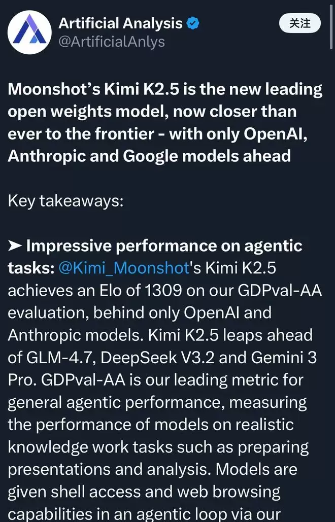 在知名第三方测评机构Artificial Analysis最新公布的大模型排名中,Kimi K2.5总体位列第五。具体得分如下:GPT5.2High得分为51,Claude Opus 4.5为50,GPT5.2CodexHigh为49,Gemini3 ProHigh为48,Kimi K2.5则为47分。