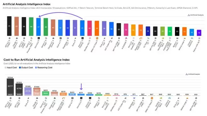 在衡量模型综合运行成本的关键指标“运行人工智分”中,Kimi K2.5的得分为371美元,这意味着其成本比Claude Opus 4.5和GPT-5.2便宜4倍以上,但比DeepSeek V3.2和GPT-OSS-120b要贵5倍以上。