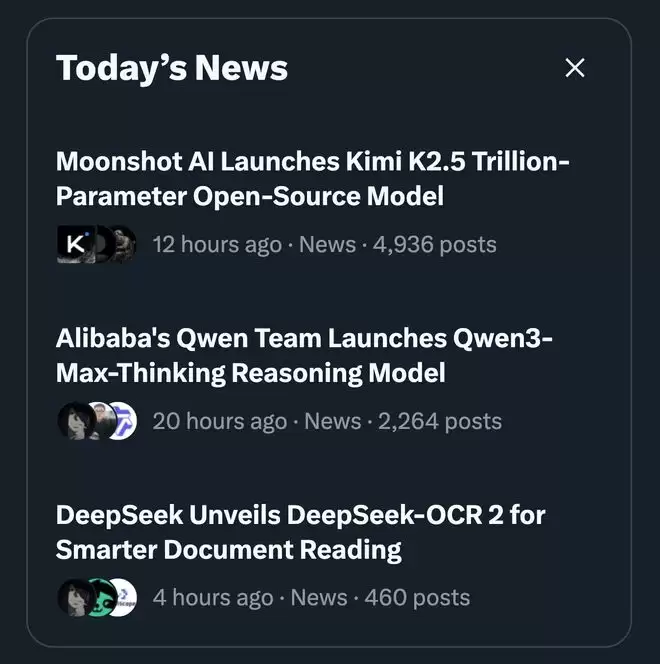 近日,多家国产模型厂商更新模型进展,包括DeepSeek开源新的OCR 2模型、Kimi发布并开源Kimi K2.5模型、阿里发布千问旗舰推理模型Qwen3-Max-Thinking,头部模型的密集更新使中国模型在当日霸榜海外社交平台X的热点前三位。据一位行业人士透露,下周也有多款国产模型产品将更新发布。
