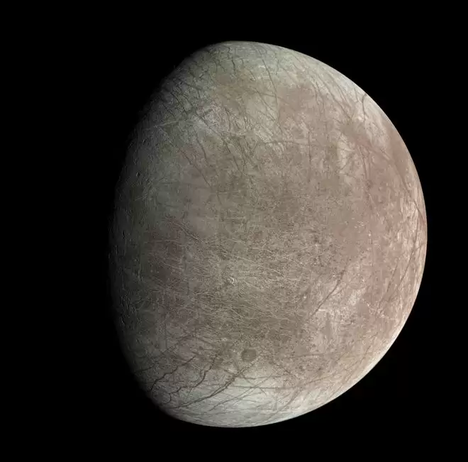 这张照片由朱诺相机在去年9月29日近距离飞掠木卫二时拍摄,影像中纵横交错的裂缝、山脊与条带清晰可见,展现了这颗冰封卫星独特的地貌特征。