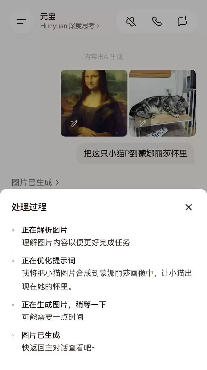 例如,我们上传一张《蒙娜丽莎的微笑》的图片和一只小猫的照片,让元宝把这只小猫P到蒙娜丽莎的怀里: