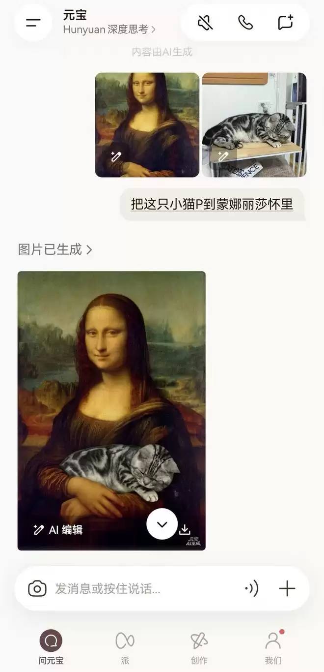不到一分钟,元宝就完成了P图,P后的图片中的小猫元素和蒙娜丽莎与原图保持一致,且手臂部分的前后透视关系也十分准确。