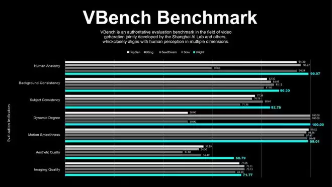 权威视频生成评测基准VBench的测评结果显示,在对于营销视频更重要的“主体一致性(Subject Consistency)”、“背景一致性(Background Consistency)”等关键维度上,Hilight的表现不仅大幅领先于行业平均水平,甚至在多项指标上超越了Sora等通用生成模型。这并非简单的参数胜利,而是其针对电商营销场景深度优化的结果。它意味着,AI生成的视频第一次在商业应用的严苛标准下,达到了“始终是同一个商品、同一个人”的工业级可靠性。