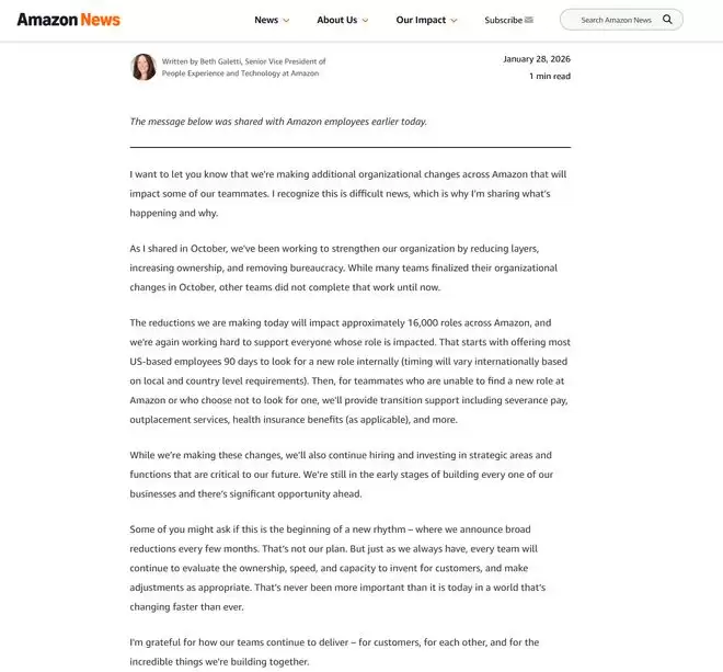 1月28日,亚马逊人力资源与技术高级副总裁贝丝·加莱蒂发文表示,公司预计将裁减约16000个职位。亚马逊方面称,将为大多数美国员工提供为期90天的内部岗位寻找机会。同时,对于无法在亚马逊找到新岗位或选择不寻找新职位的员工,亚马逊将提供过渡支持,包括遣散费、职业介绍服务、医疗保险福利等。