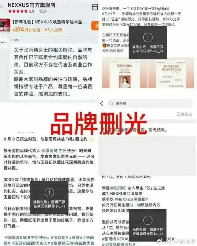 紧接着,奢思雅、NEXXUS、玉容初等多个品牌也陆续撤下她的代言物料。