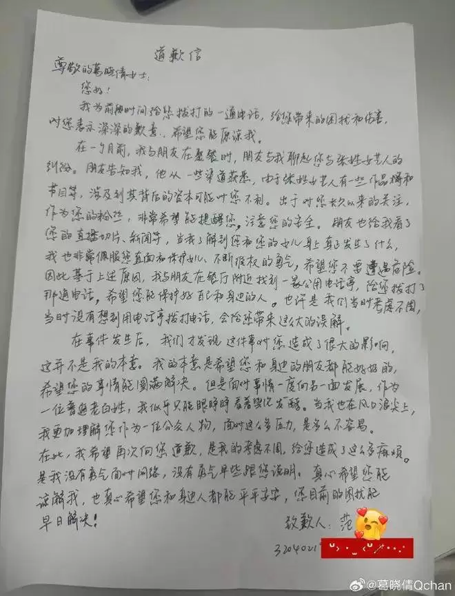 并且手写了道歉信。