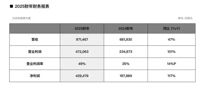1月28日,存储芯片制造商海力士发布了截至2025年12月31日的财年及第四季度财务报告。公司全年营收达到97.1467万亿韩元,同比增长近五成;营业利润为47.2063万亿韩元,较上年大增约101%,营业利润率高达49%;净利润录得42.9479万亿韩元,增长超过117%,净利润率达到44%。