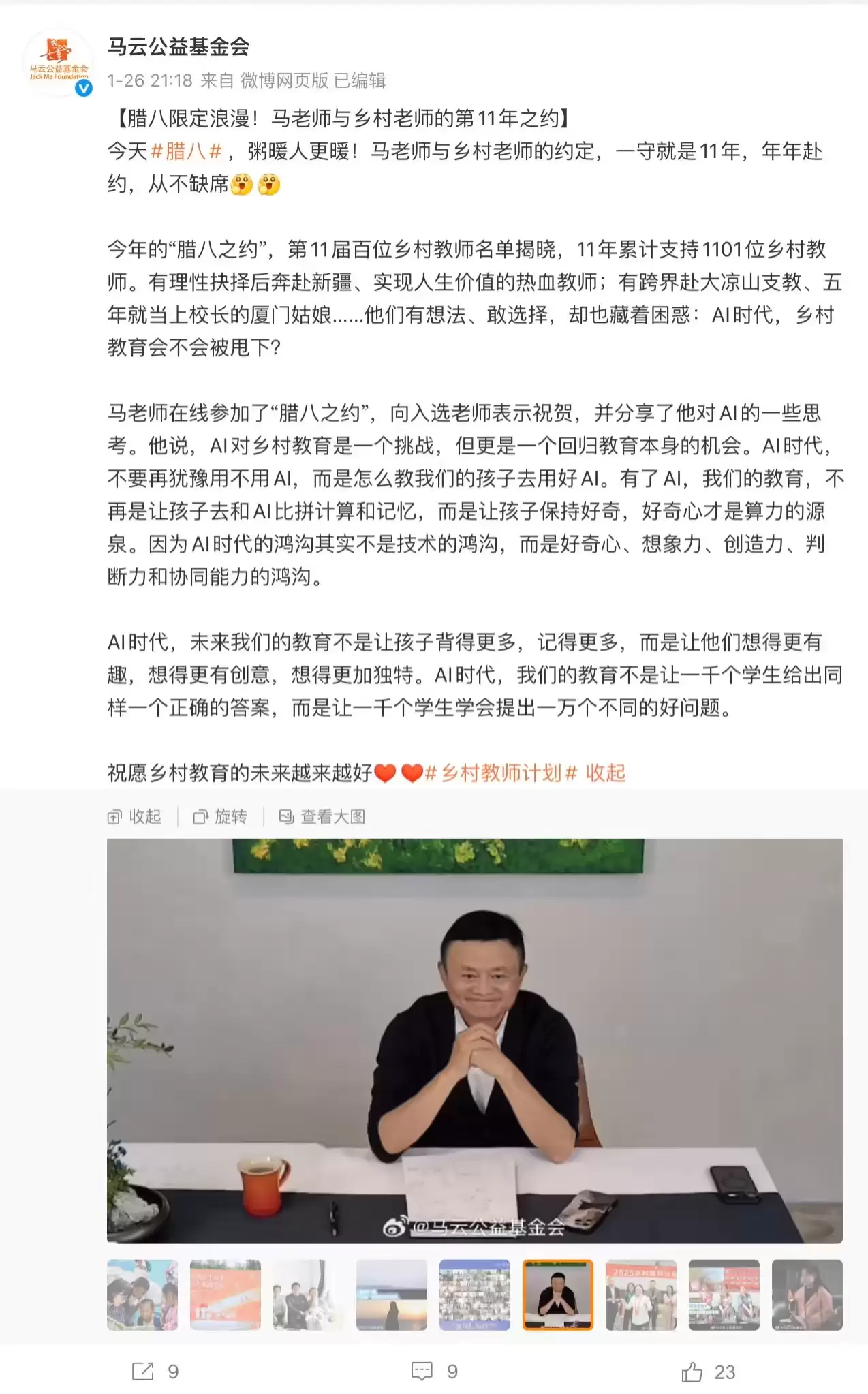 近日,一场以“腊八之约”为主题的活动上,马云公益基金会公众号分享了马云关于人工智能与教育融合的深入思考。这一分享迅速引发了社会各界对AI时代教育方向的广泛关注与热烈讨论。