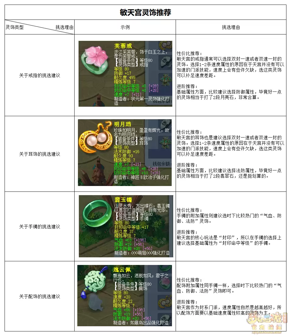 对于敏天宫而言,灵饰方面的选择面比较宽。通常建议选择附加多条封印、速度属性的前排灵饰,以及附加气血、防御、法防等属性的后排灵饰。挑选时一定要注意灵饰的基础属性,细节越好,保值性和流通性就越高。具体如下: