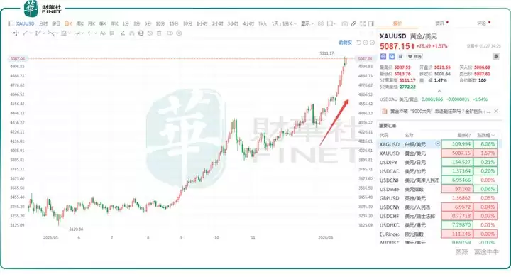 步入2026年,黄金的上涨势头并未停歇,金价持续攀升,并于1月26日首次突破5100美元整数关口,但随后出现回落。截至1月27日发稿时,金价再度上涨近1.6%,现报5085美元/盎司,已十分接近前一日创下的历史高位。
