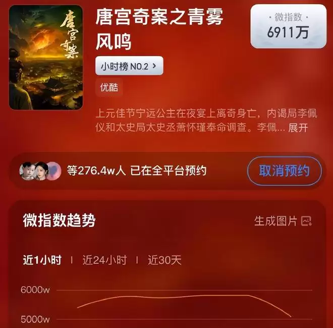 《生命树》的双端预约已突破100万,这是非常亮眼的,但我们要知道,白鹿和王星越主演的《唐宫奇案》,预约已突破200万,也就是说,这部剧也自带关注度和热度。